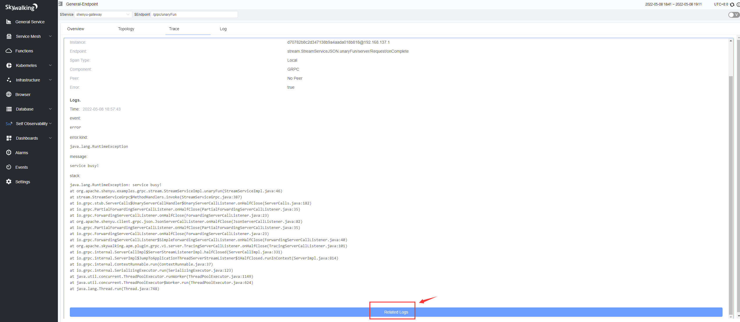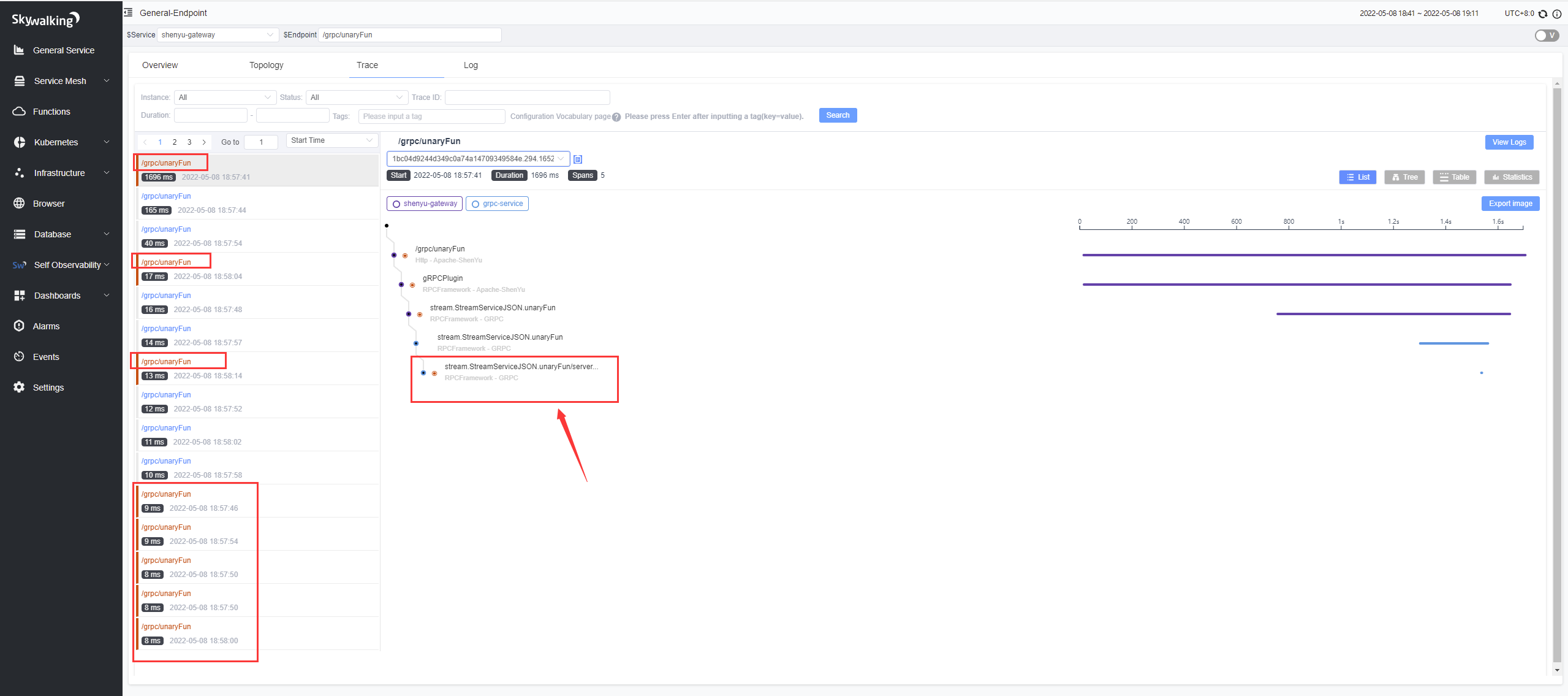 The existing SkyWalking gRPC plugin only supports calls initiated by way of stubs. For the gateway there is no proto file, the gateway takes generalized calls (not through stubs), so tracing RPC requests, you will find that the link will break at the gateway node. In this case, it is necessary to make the gRPC plugin support generalized calls, while at the same time needing to remain compatible and not affect the original tracing method. This is achieved by determining whether the request parameter is a DynamicMessage, and if it is not, then the original tracing logic through the stub is used. If not, then the original tracing logic via stubs is used, and if not, then the generalized call tracing logic is used. The other compatibility is the difference between the old and new versions of gRPC, as well as the compatibility of various cases of obtaining server-side IP, for those interested in the source code.