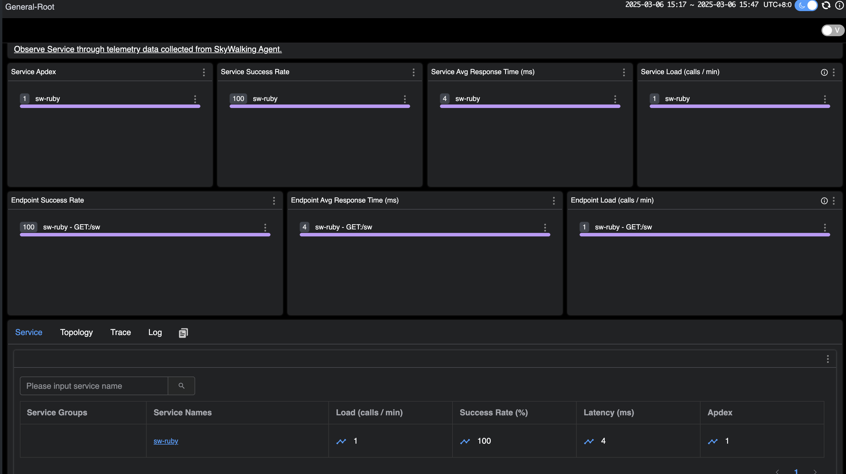 After a few seconds, revisit the SkyWalking UI at http://localhost:8080. You will be able to see the deployed demo service on the homepage.