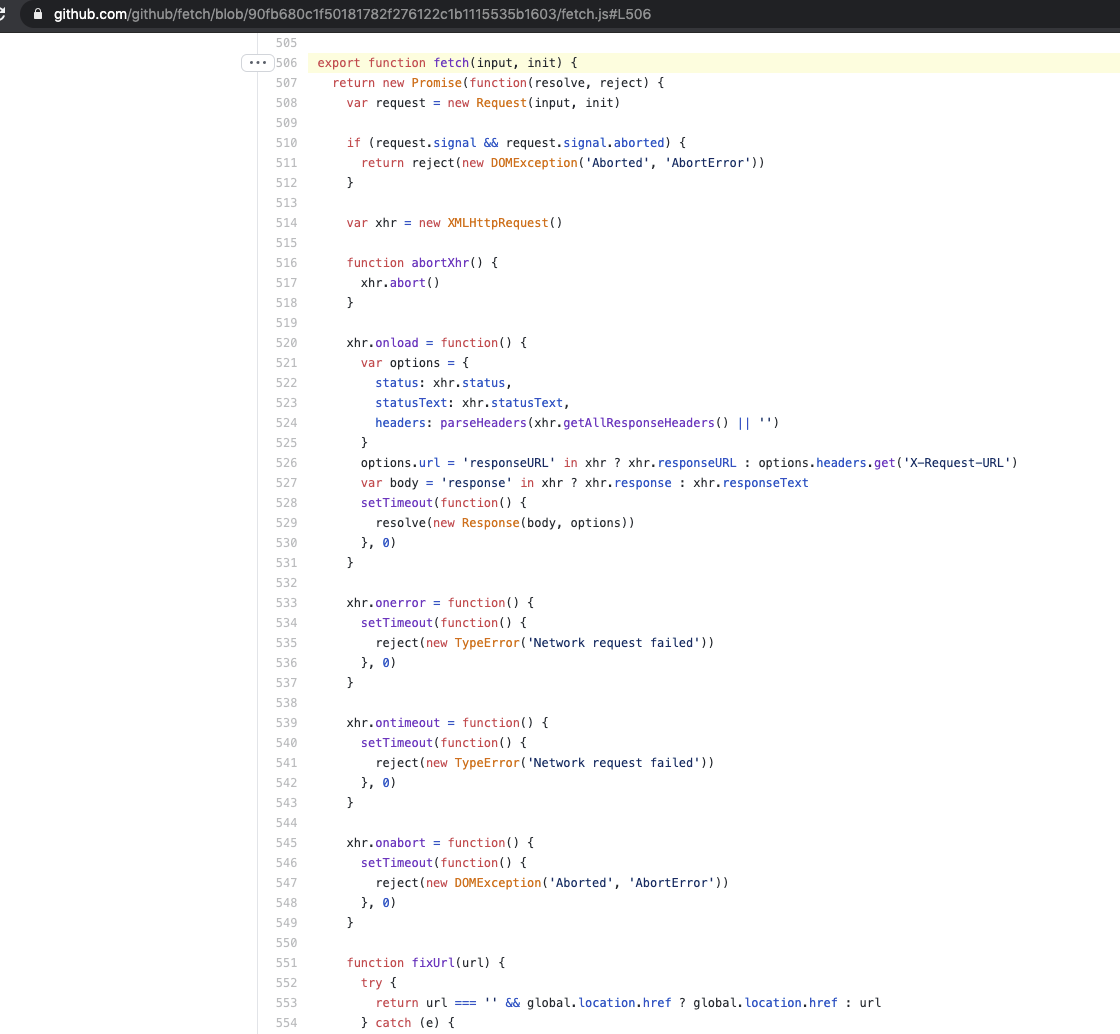 As you can see, it creates a promise and a new XMLHttpRequest object. Because the code of the fetch is built into the browser, it must monitor the code execution first. Therefore, when we add listening events, we can’t monitor the code in the fetch. Just after monitoring the code execution, let’s rewrite the fetch: