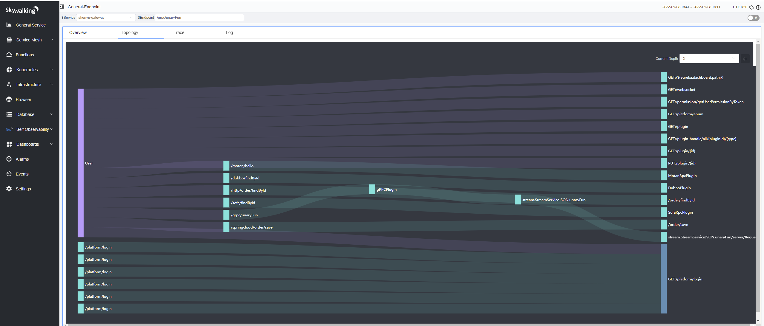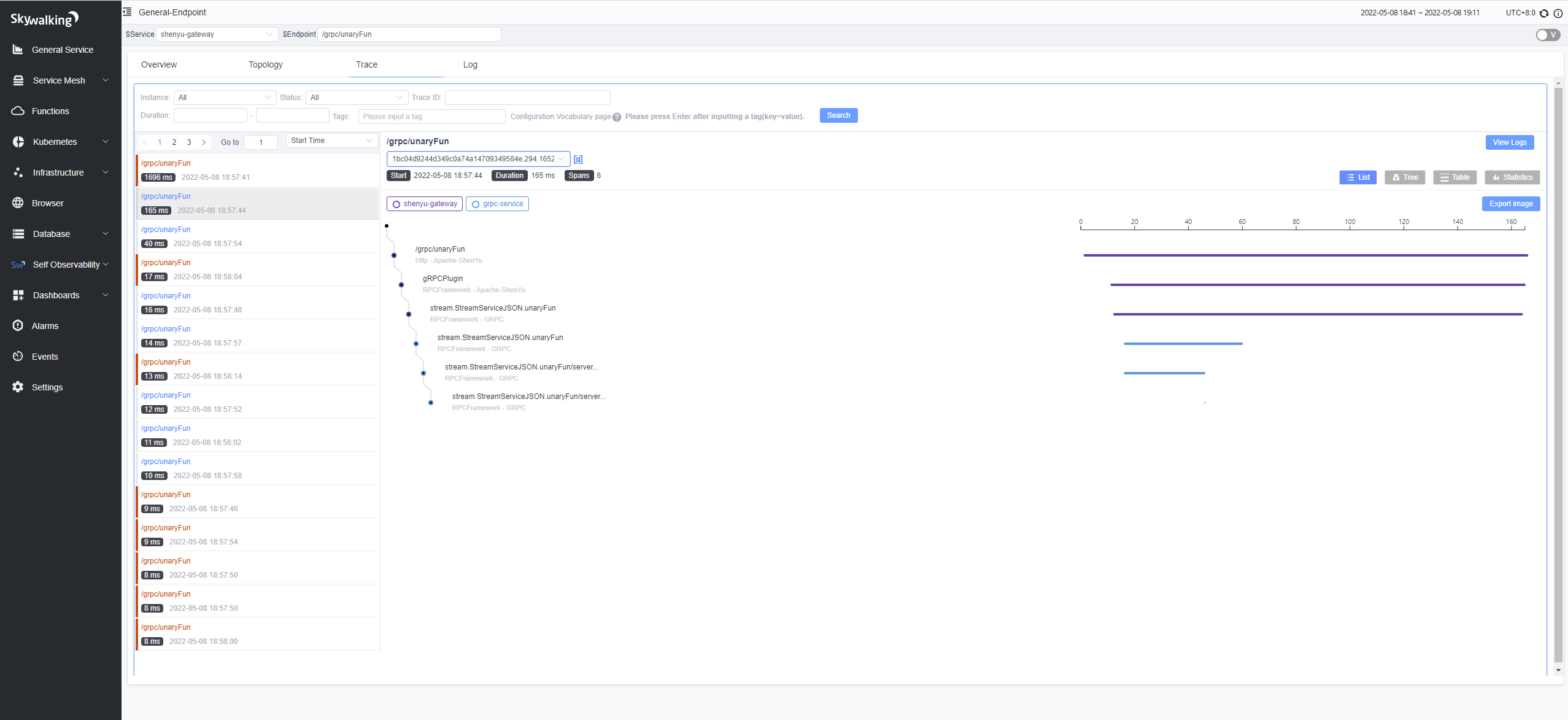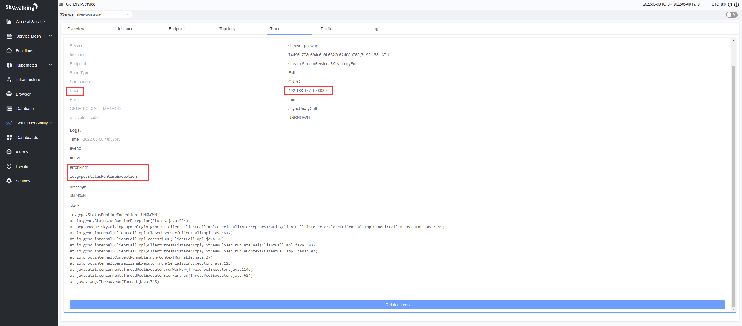 现有的SkyWalking gRPC插件只支持通过存根的方式发起的调用。而对于网关而言并没有proto文件,网关采取的是泛化调用(不通过存根),所以追踪rpc请求,你会发现链路会在网关节点断掉。 在这种情况下,需要让gRPC插件支持泛化调用,而同时需要保持兼容,不影响原先的追踪方式。实现上通过判断请求参数是否是动态消息(DynamicMessage),如果不是则走原先通过存根的追踪逻辑, 如果是则走泛化调用追踪逻辑。另外的兼容则是在gRPC新旧版本的差异,以及获取服务端IP各种情况的兼容,感兴趣的可以看看源码。