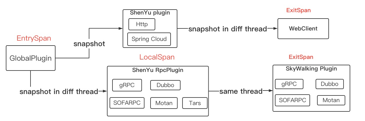 也许你会问是否可以在一个通用的插件里面创建LocalSpan,而不是ShenYu RPC插件分别创建一个? 答案是不行,因为需要保证LocalSpan和ExitSpan在同一个线程,而ShenYu是全链路异步. 在实现上创建LocalSpan的代码是复用的。