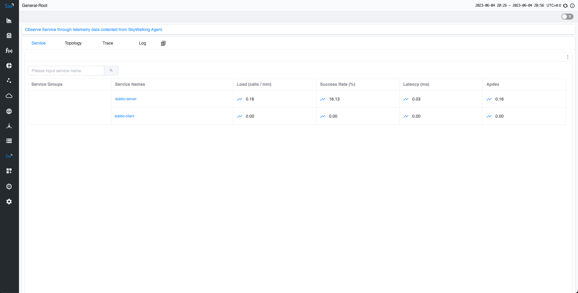 现在,由于客户端会自动像服务器端发送请求,现在就可以在 SkyWalking UI 中观察结果。
